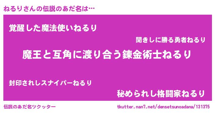 | ヒーロー風カッコイイあだ名 | 『慈愛の使者ねるり』『炎刃騎士ネル』 |