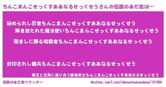 | ヒーロー風カッコイイあだ名 | 『ネオチンコマンコセックスアアナルセックセウ』 |