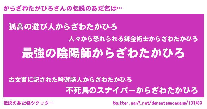 | 男性向けラノベタイトル風あだ名 | 『うちのからざわたかひろが世界を掌握している!』 |