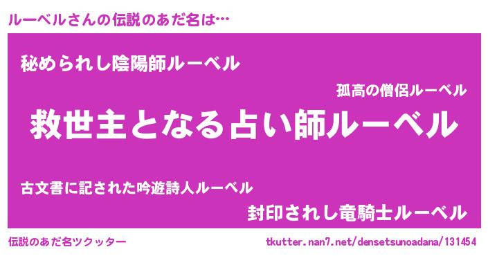 | 男性向けラノベタイトル風あだ名 | 『ルーベルに滅ぼされるだけの簡単なお仕事です』 |