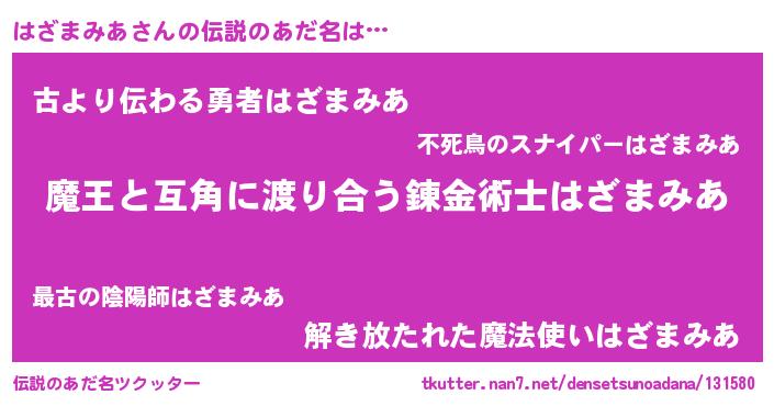 | 意味不明あだ名 | 『住所不定無職はざまみあ(98歳)』 |