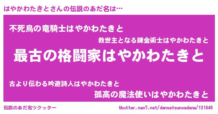 | 男性向けラノベタイトル風あだ名 | 『はやかわたきとに滅ぼされるだけの簡単なお仕事です』 |
