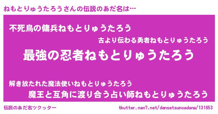 | 男性向けラノベタイトル風あだ名 | 『この素晴らしい世界にねもとりゅうたろうを!』 |