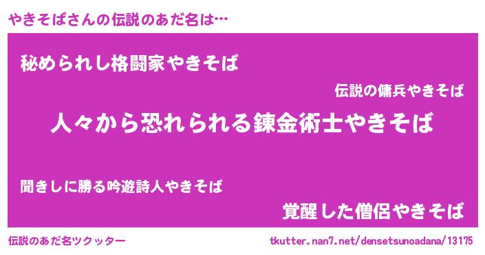 | ヒーロー風カッコイイあだ名 | 『正義の使者やきそば』『炎刃騎士ヤキ』 |