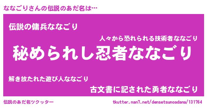 | 女子向けラノベタイトル風あだ名 | 『ななごりの雑貨屋さん』『闇のななごり』 |