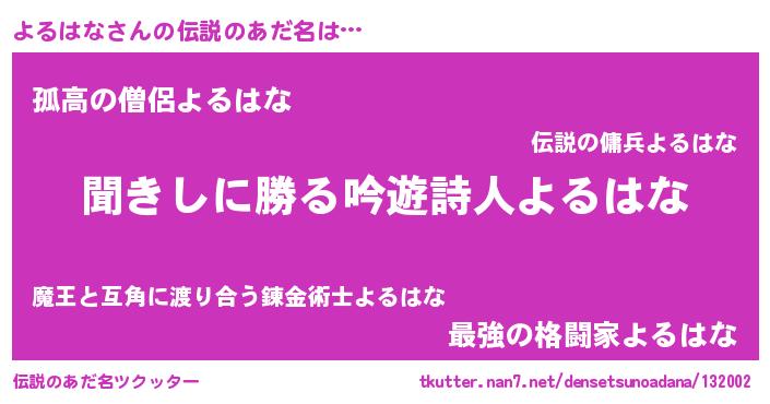 | ヒーロー風カッコイイあだ名 | 『ネオヨルハナ』『究極戦士ヨルハナ』 |