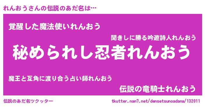 | ヒーロー風カッコイイあだ名 | 『ウルトラれんおうマン』『炎刃騎士レン』 |
