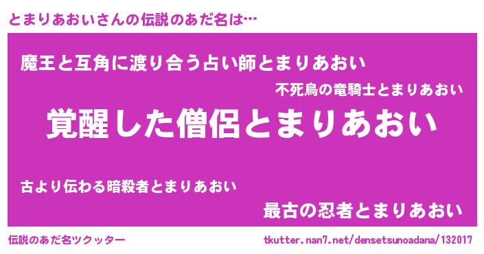 | 男性向けラノベタイトル風あだ名 | 『とまりあおいの嫁は女の子じゃないと思った?』 |