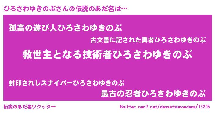| 男性向けラノベタイトル風あだ名 | 『ひろさわゆきのぶに滅ぼされるだけの簡単なお仕事です』 |