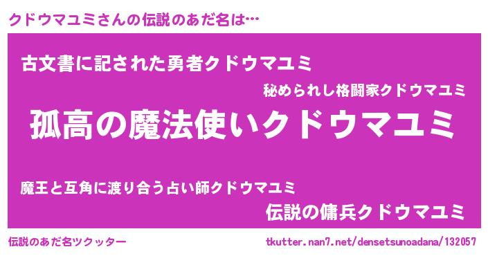 | 女子向けラノベタイトル風あだ名 | 『クドウマユミが死なない童話 林檎のクドウマユミの診療簿』 |