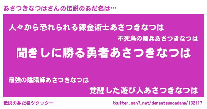 | 女子向けラノベタイトル風あだ名 | 『異世界で失敗しない100のあさつきなつは』 |
