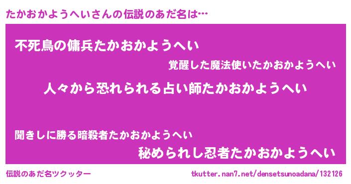 | 意味不明あだ名 | 『眠気覚ましガムたかおかようへい味』 |