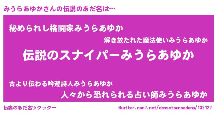 男性向けラノベタイトル風あだ名 | 『魔弾の王とみうらあゆか』 |