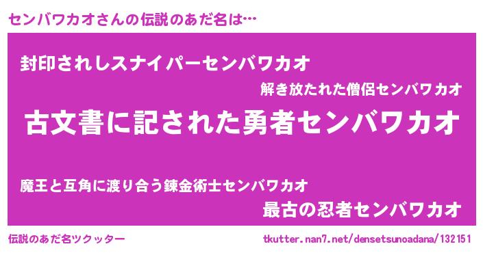 | 男性向けラノベタイトル風あだ名 | 『センバワカオ~年齢イコール彼女いない歴の魔法使い~』 |