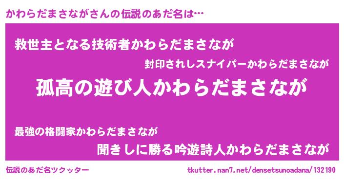| ヒーロー風カッコイイあだ名 | 『暗黒騎士カワ』『ネオカワラダマサナガ』 |