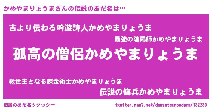 | ヒーロー風カッコイイあだ名 | 『黄金騎士カメ』『ネオカメヤマリョウマ』 |