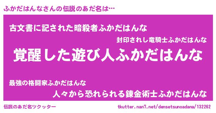| 男性向けラノベタイトル風あだ名 | 『ふかだはんな~年齢イコール彼女いない歴の魔法使い~』 |