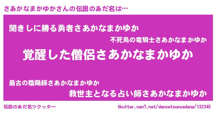 | ヒーロー風カッコイイあだ名 | 『炎刃騎士サア』『ネオサアカナマカユカ』 |