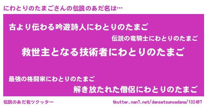 | ヘコむあだ名 | 『にわとりのたまご(笑)』『にわ太郎』 |