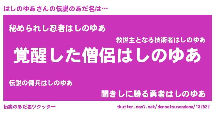 | 意味不明あだ名 | 『自称はしのゆあ』『永久保存はしのゆあ』 |