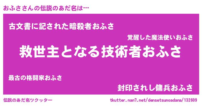 | 男性向けラノベタイトル風あだ名 | 『おふさ~年齢イコール彼女いない歴の魔法使い~』 |