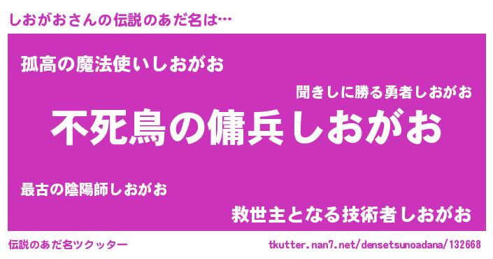| 意味不明あだ名 | 『なめこ科しおがお属』『自称しおがお』 |