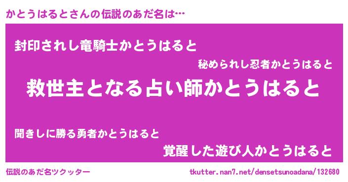 | 男性向けラノベタイトル風あだ名 | 『かとうはると~年齢イコール彼女いない歴の魔法使い~』 |