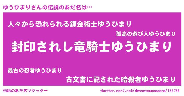 | ヒーロー風カッコイイあだ名 | 『究極戦士ユウヒマリ』『仮面ユウダー』 |