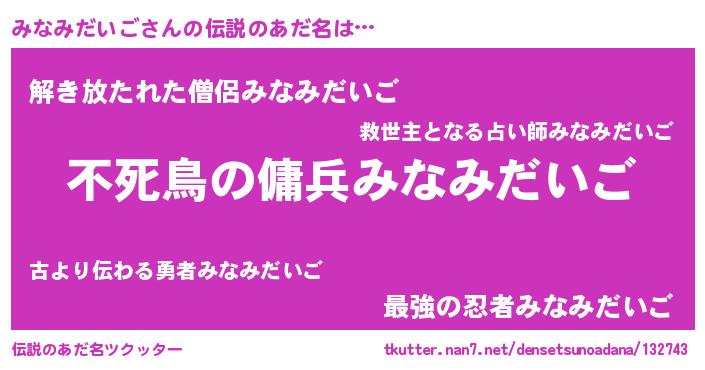 | ヒーロー風カッコイイあだ名 | 『スーパーミナミダイゴ』『天弓騎士ミナ』 |