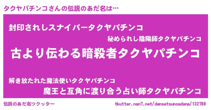 | 女子向けラノベタイトル風あだ名 | 『タクヤパチンコの契約王妃』 |