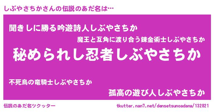 | 肩書あだ名 | 『しぶやさちか少将』『しぶやさちか閣下』 |