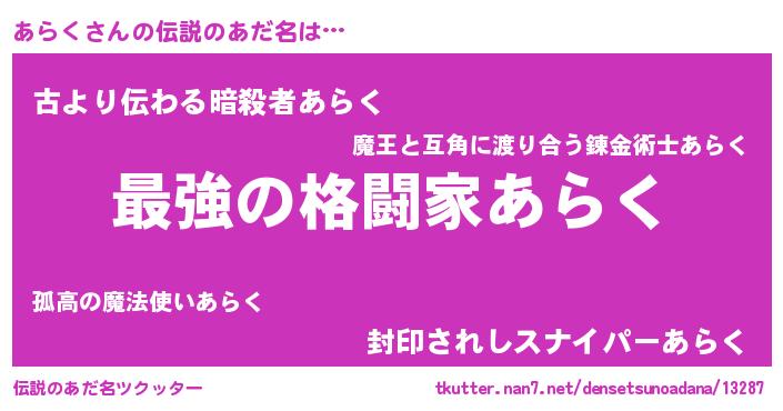| ヒーロー風カッコイイあだ名 | 『ウルトラあらくマン』『ネオアラク』 |