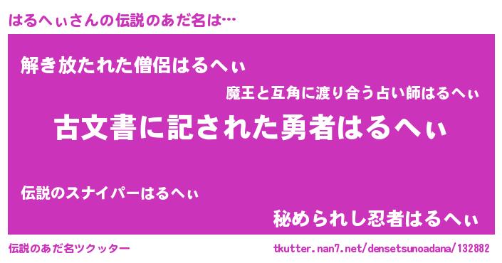 | 意味不明あだ名 | 『永久保存はるへぃ』『自称はるへぃ』 |