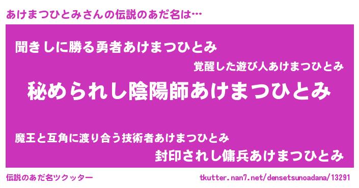 | 男性向けラノベタイトル風あだ名 | 『アケマツヒトミスレイヤー』 |