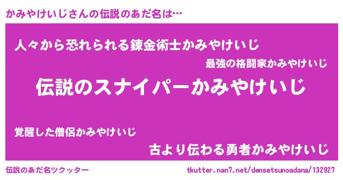 | 胡散臭い通販商品みたいなあだ名 | 『必ず成功する霊験あらたかなお札…その名も「かみやけいじ」』 |