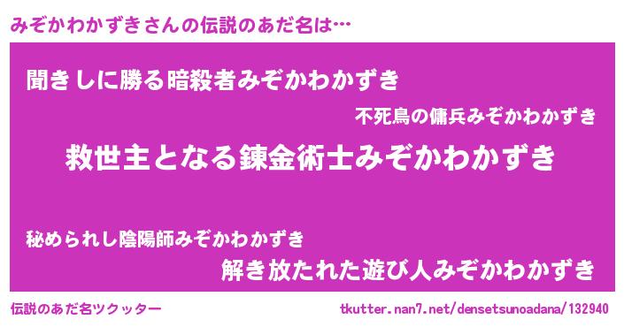 | 男性向けラノベタイトル風あだ名 | 『みぞかわかずきに滅ぼされるだけの簡単なお仕事です』 |