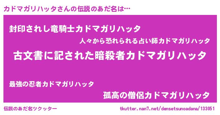 | 意味不明あだ名 | 『永久保存カドマガリハッタ』 |