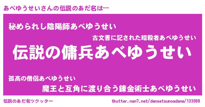 | 男性向けラノベタイトル風あだ名 | 『あべゆうせいの憂鬱』 |