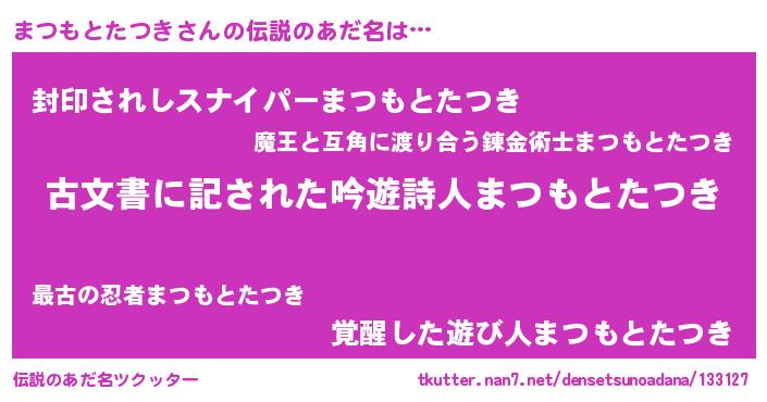 | 男性向けラノベタイトル風あだ名 | 『まつもとたつき~年齢イコール彼女いない歴の魔法使い~』 |