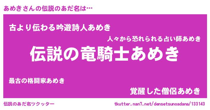 | 男性向けラノベタイトル風あだ名 | 『緋弾のアメキ』『はたらくあめきさま!』 |