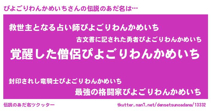 | 男性向けラノベタイトル風あだ名 | 『ぴよごりわんかめいちに滅ぼされるだけの簡単なお仕事です』 |