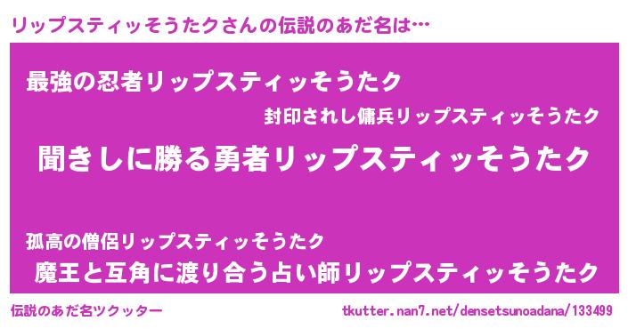 | 男性向けラノベタイトル風あだ名 | 『リップスティッそうたクという概念が存在しない退屈な世界 』 |