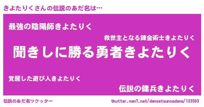 | 男性向けラノベタイトル風あだ名 | 『キヨタリクスレイヤー』 |
