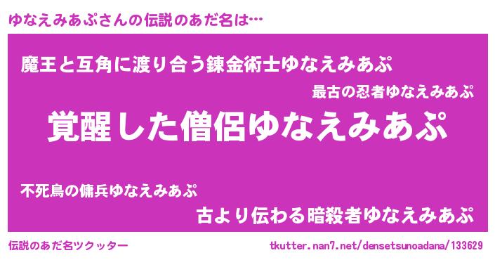 | ポケモン風あだ名 | 『ヒユナエミアプ』『ユックウザ』 |