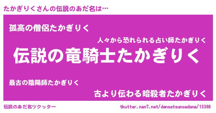 | 男性向けラノベタイトル風あだ名 | 『緋弾のタカギリク』『たかぎりくの憂鬱』 |