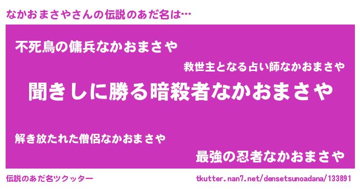 | 男性向けラノベタイトル風あだ名 | 『ナカオマサヤスレイヤー』 |