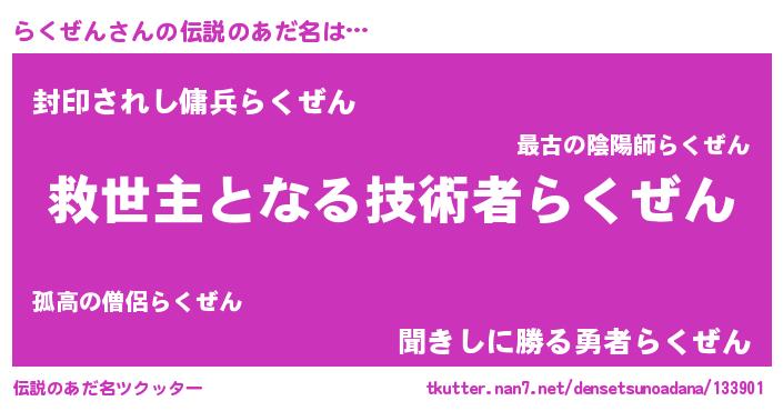 | 男性向けラノベタイトル風あだ名 | 『らくぜんに滅ぼされるだけの簡単なお仕事です』 |