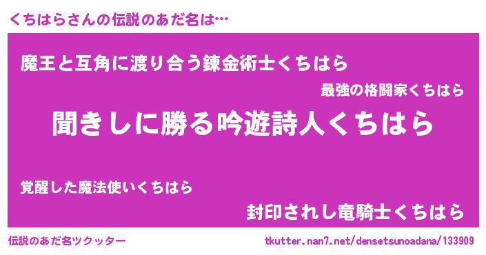 | 男性向けラノベタイトル風あだ名 | 『クチハラスレイヤー』 |