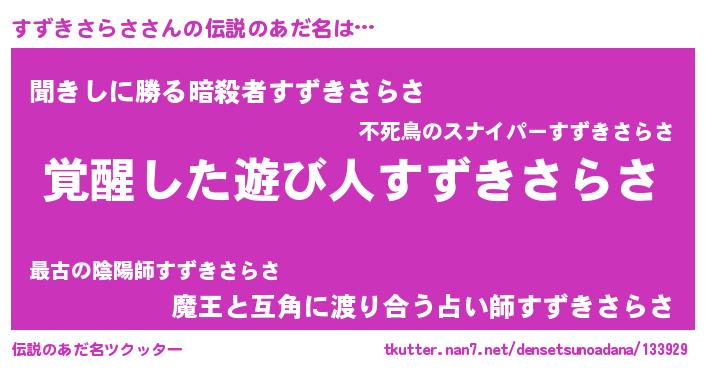 | ヒーロー風カッコイイあだ名 | 『天弓騎士スズ』『ネオスズキサラサ』 |