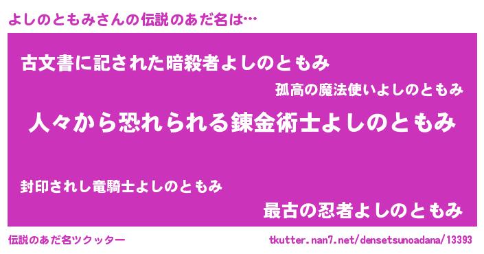 | 男性向けラノベタイトル風あだ名 | 『おまえをオタクにしてやるから、俺をよしのともみにしてくれ! 』 |